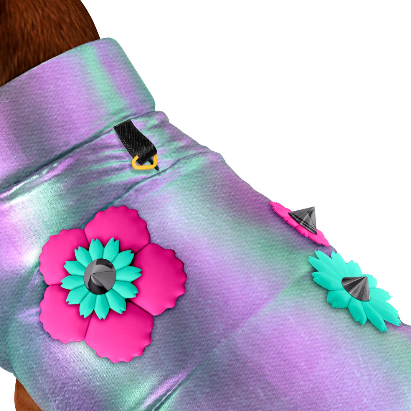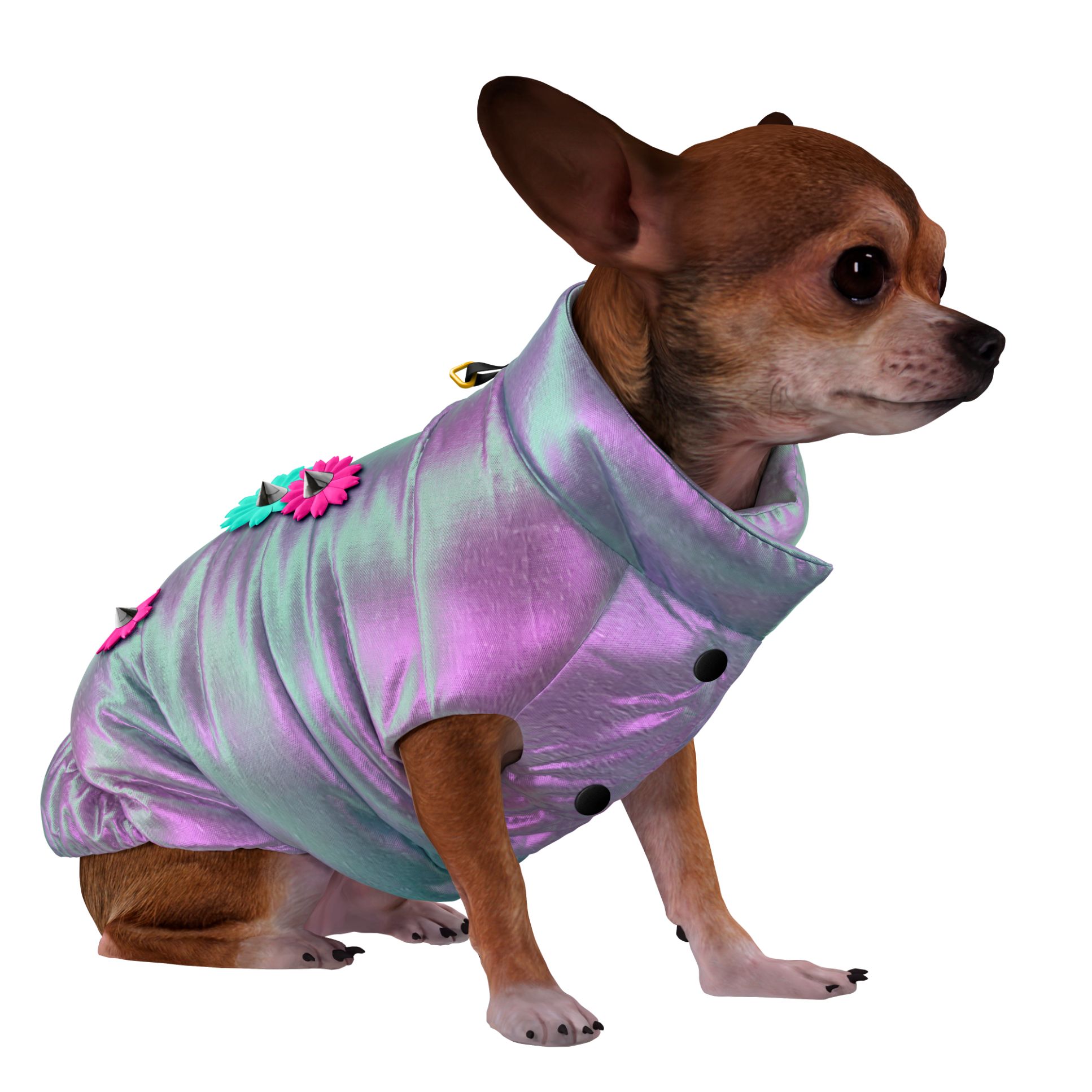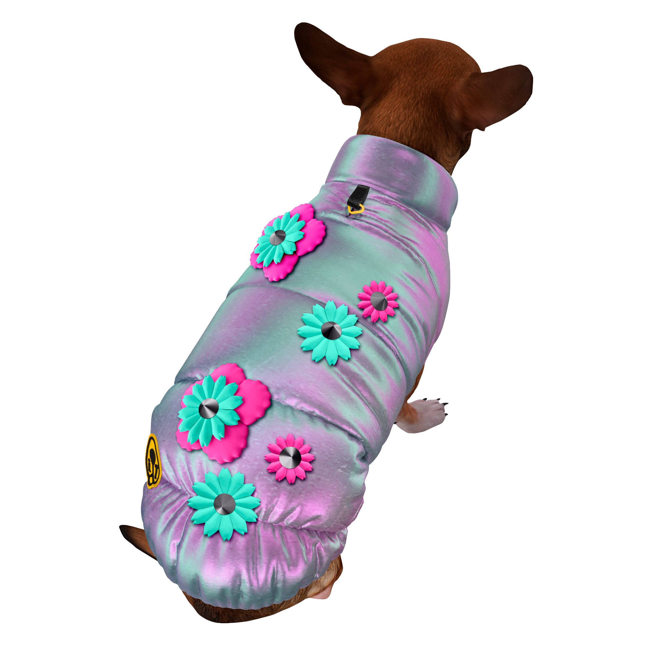 Gilet imbottito in limited edition per cani di media e piccola taglia, anche in versione conformata per bulldog francese. Ideale per godersi le ultime giornate invernali, realizzato a mano in Italia in tessuto rifrangente, antiacqua e antivento impreziosito da eleganti decorazioni floreali applicate a mano con borchie. Imbottitura Primaloft® Silver Eco, in poliestere riciclato. Modello con foro di uscita ed attacco esterno per guinzaglio. Imbragatura elastica che stabilizza la vestibilità. Chiusura a bottoni.