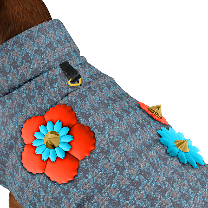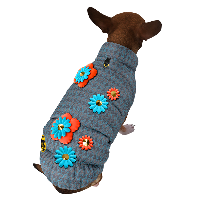 I.T.’S FAMILY Blooming Cool è il gilet imbottito dalla linea attillata per cani di media e piccola taglia. Ideale per le giornate più fredde, è disponibile in 4 taglie, dalla S alla XL oltre al conformato per bulldog francese. I.T.’S FAMILY Blooming Cool è realizzato a mano in Italia in tessuto tecnico dall’effetto laniero nei toni dell’azzurro con eleganti decorazioni floreali di dimensioni e tessuti diversi applicati a mano con borchie.