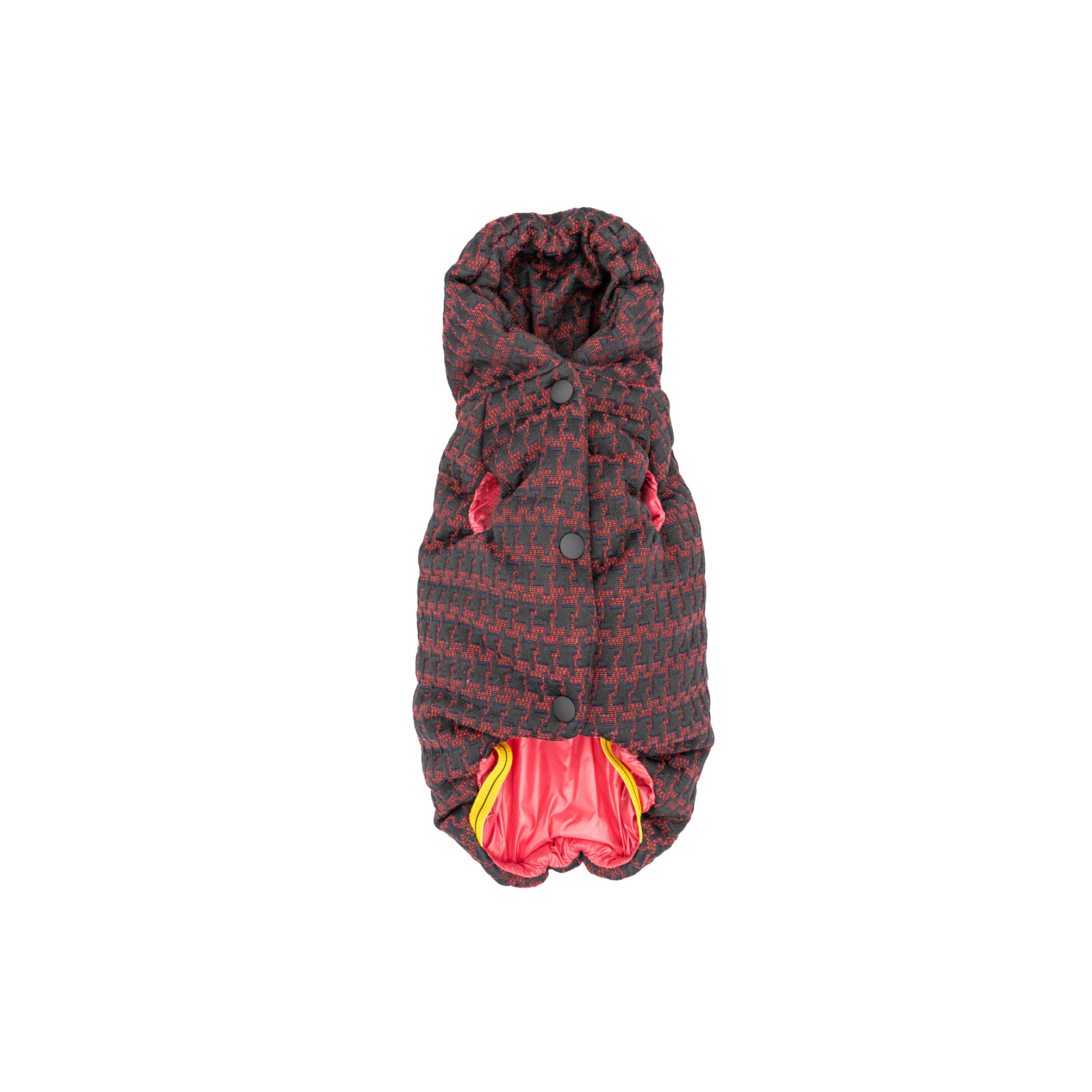 Modello con foro di uscita ed attacco esterno per guinzaglio ed imbragatura elastica che stabilizza la vestibilità. Chiusura a bottoni.