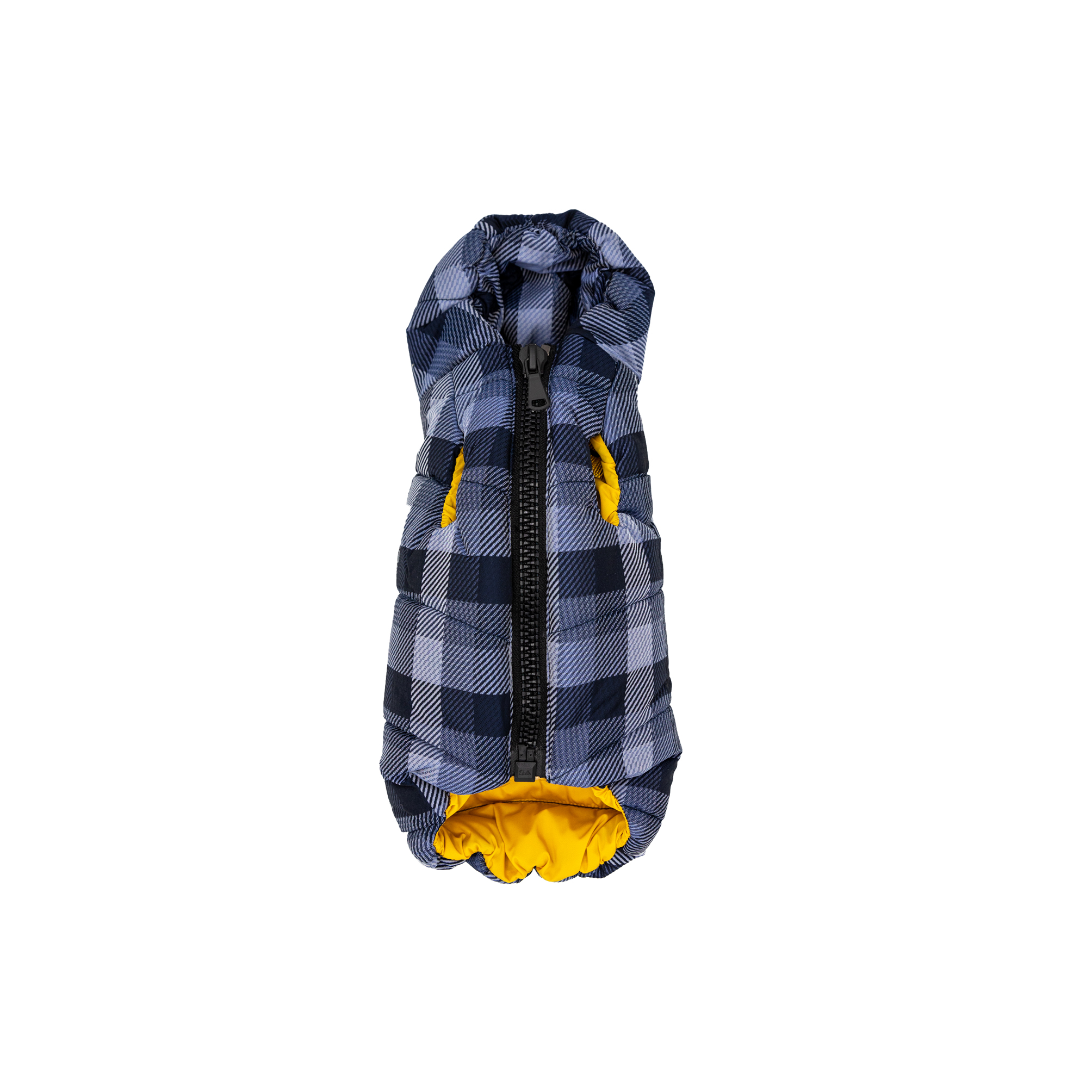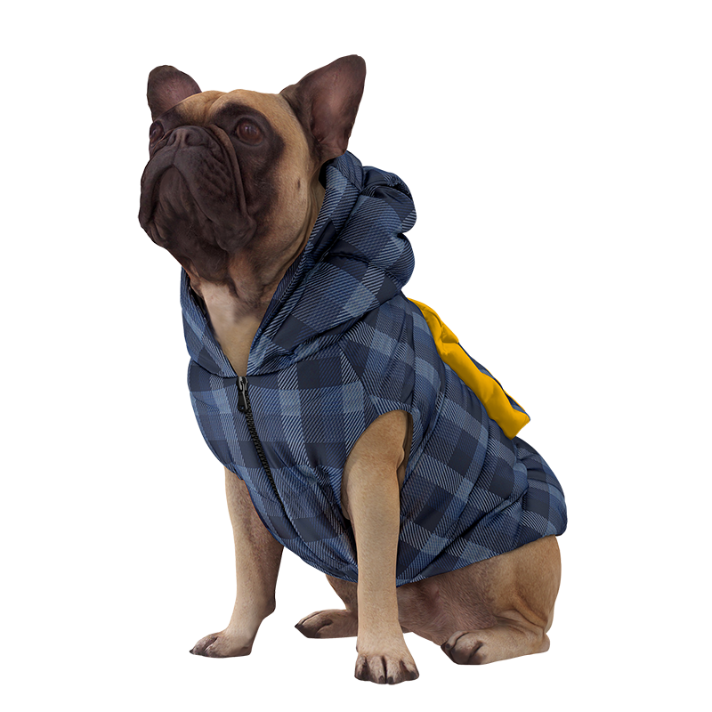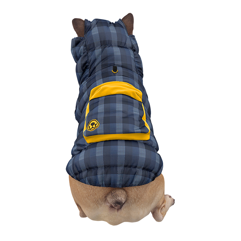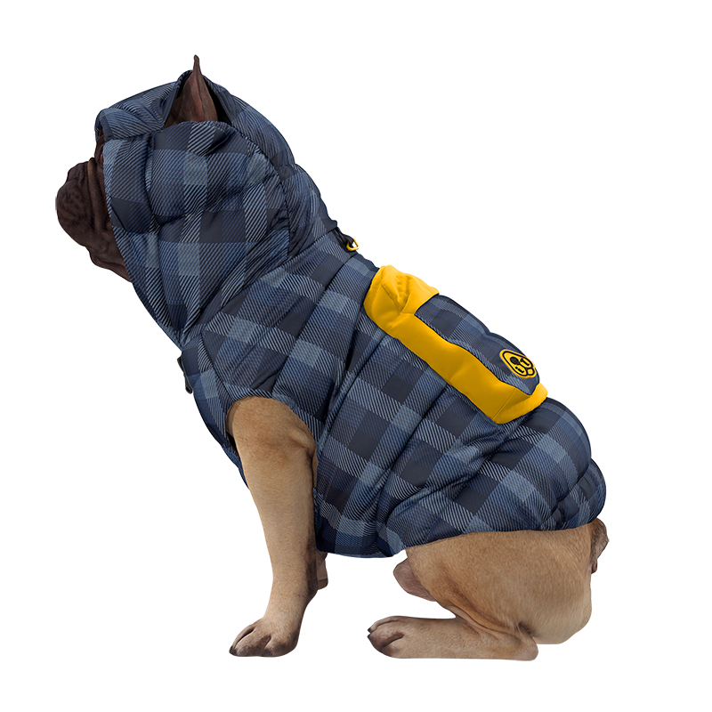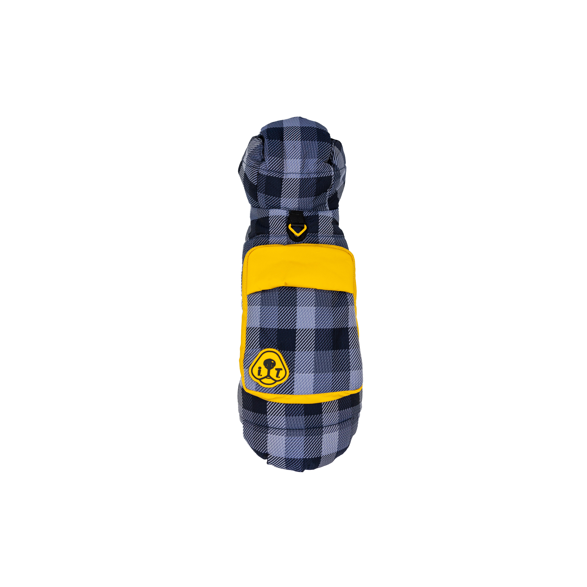 I.T.’S FAMILY Check è il piumino imbottito dalla linea attillata per cani di media e piccola taglia, con cappuccio e tasca porta accessori sulla schiena. Ideale per le giornate più fredde, è disponibile in 4 taglie, dalla S alla XL oltre al conformato per bulldog francese. I.T.’S FAMILY Check è realizzato a mano in Italia in tessuto jacquard in tessuto jacquard scozzese nelle tonalità del blu e dell’indaco con dettaglio a contrasto giallo sulla tasca. Il cappuccio si caratterizza per le aperture laterali che lasciano libere le orecchie. L’imbottitura è Primaloft® Silver Eco, in poliestere riciclato.