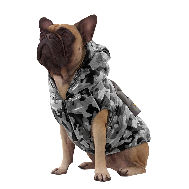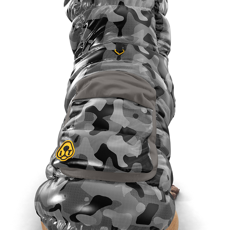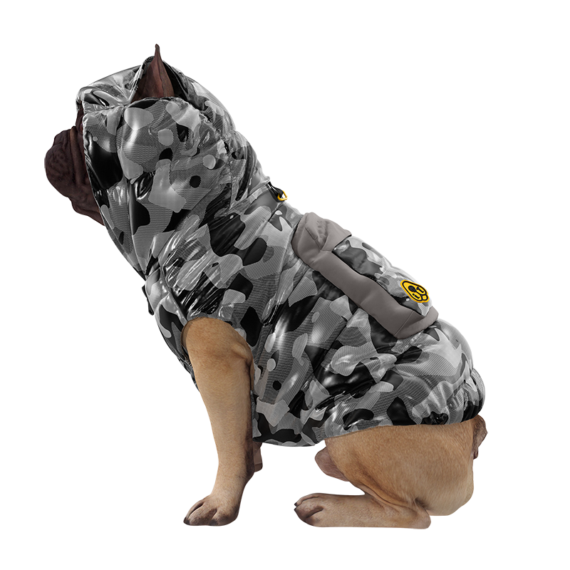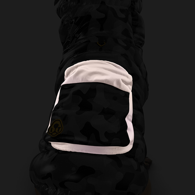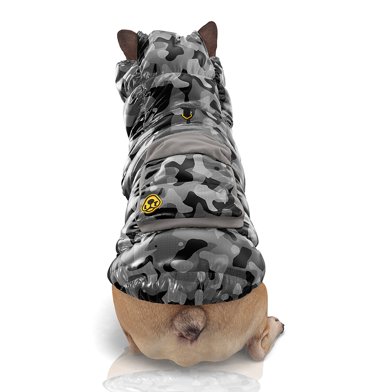 I.T.’S FAMILY Night Camou è il piumino imbottito dalla linea attillata per cani di media e piccola taglia, con cappuccio e tasca porta accessori sulla schiena. Ideale per le giornate più fredde, è disponibile in 4 taglie, dalla S alla XL oltre al conformato per bulldog francese. I.T.’S FAMILY Night Camou è realizzato a mano in Italia in tessuto jacquard lucido a fantasia camouflage con dettaglio rifrangente sulla tasca. Il cappuccio si caratterizza per le aperture laterali che lasciano libere le orecchie. L’imbottitura è Primaloft® Silver Eco, in poliestere riciclato.