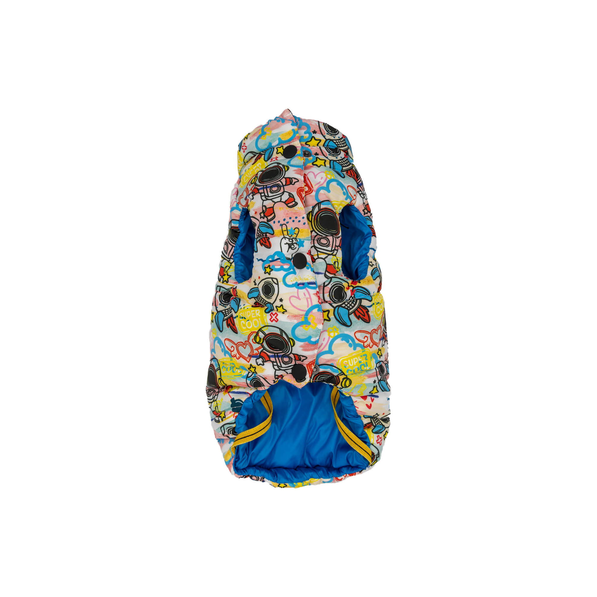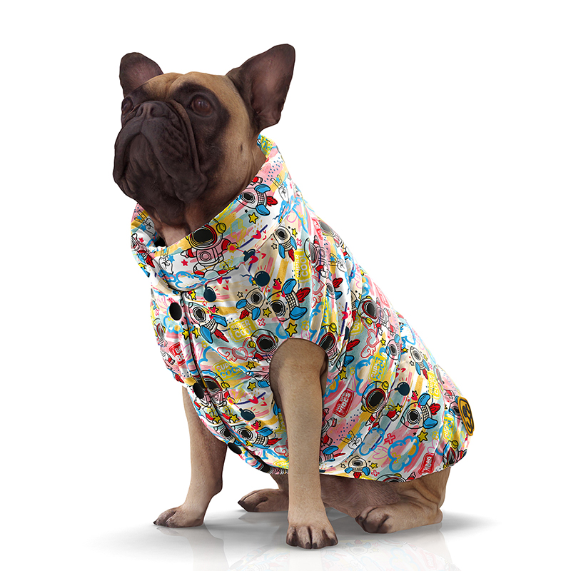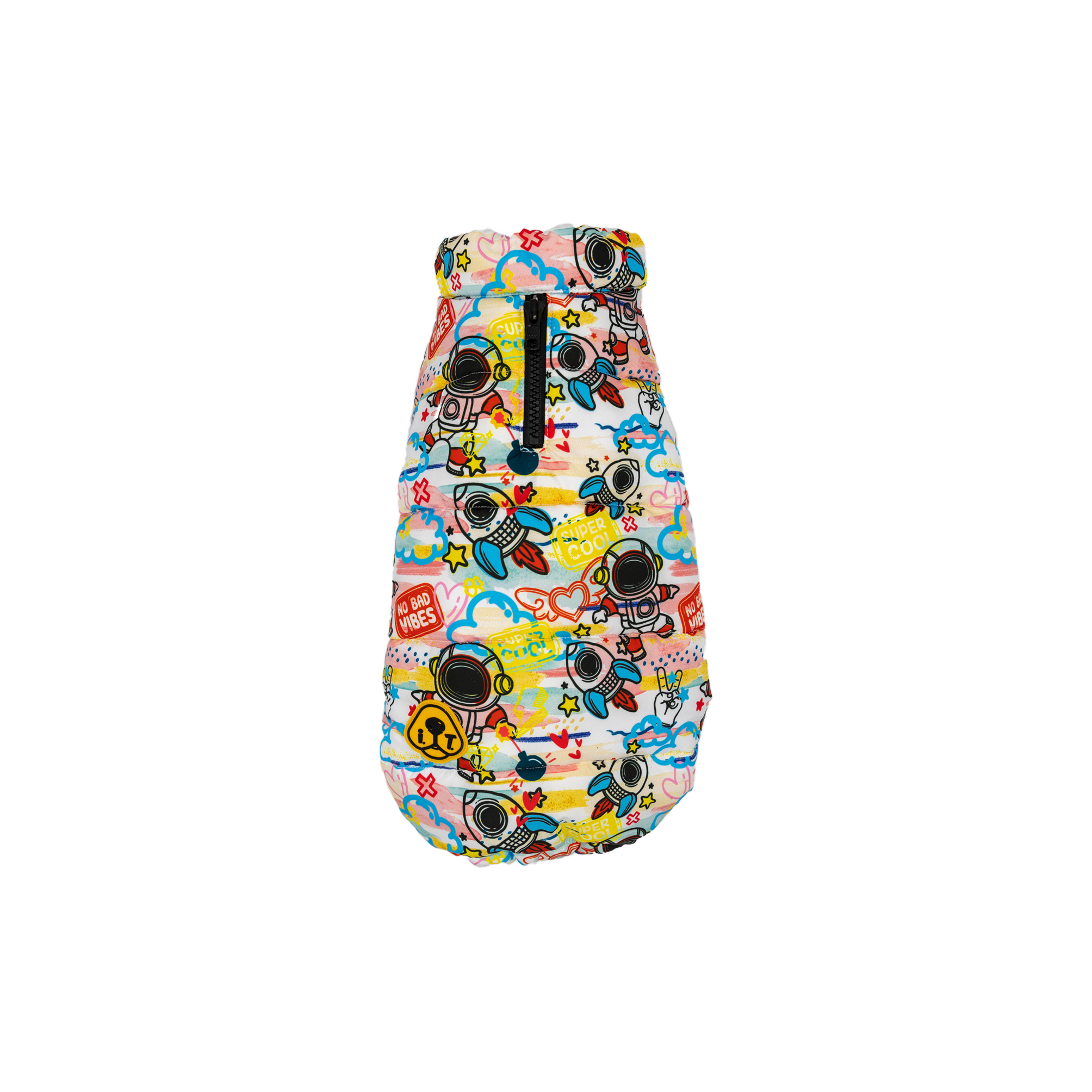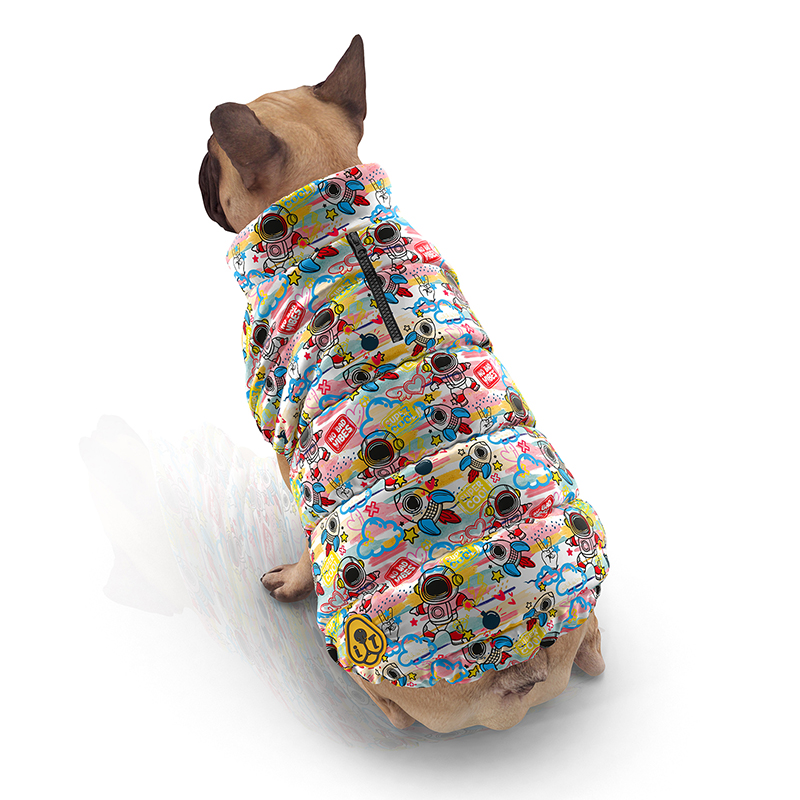 I.T.’S FAMILY Space è il gilet imbottito per cani ideale per le giornate più fredde. Pensato in modo particolare per cani di taglia media e piccola, è disponibile in 4 taglie, dalla S alla XL oltre al conformato per bulldog francese. I.T.’S FAMILY Space è realizzato a mano in Italia in tessuto stampato antigoccia con una grafica multicolore che richiama atmosfere spaziali arricchita dalla scritta “No bad vibes”. L’imbottitura è Primaloft® Silver Eco, in poliestere riciclato. E’ dotato di zip sulla schiena per l’attacco del guinzaglio o della pettorina. Il bottone di chiusura con regolazione permette di adeguare la vestibilità mentre l’elastico soft touch sulle zampe posteriori rende più avvolgente e stabile il capo.